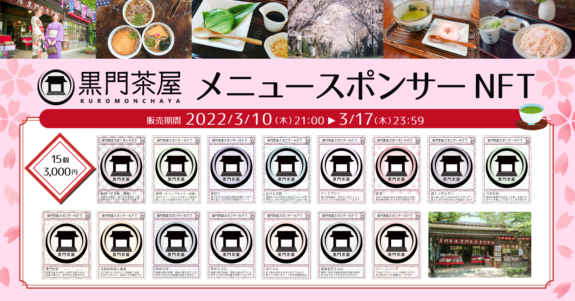 飲食店としては九州地区初となるNFT(非代替性トークン)の発行を、スポンサーNFTをプロデュースする国産マーケットプレイス大手「HEXA」(メディアエクイティ株式会社様)の特設ページにて行います。 第一弾として明日10日21時より黒門茶屋NFT・限定15個の販売を開始いたします。