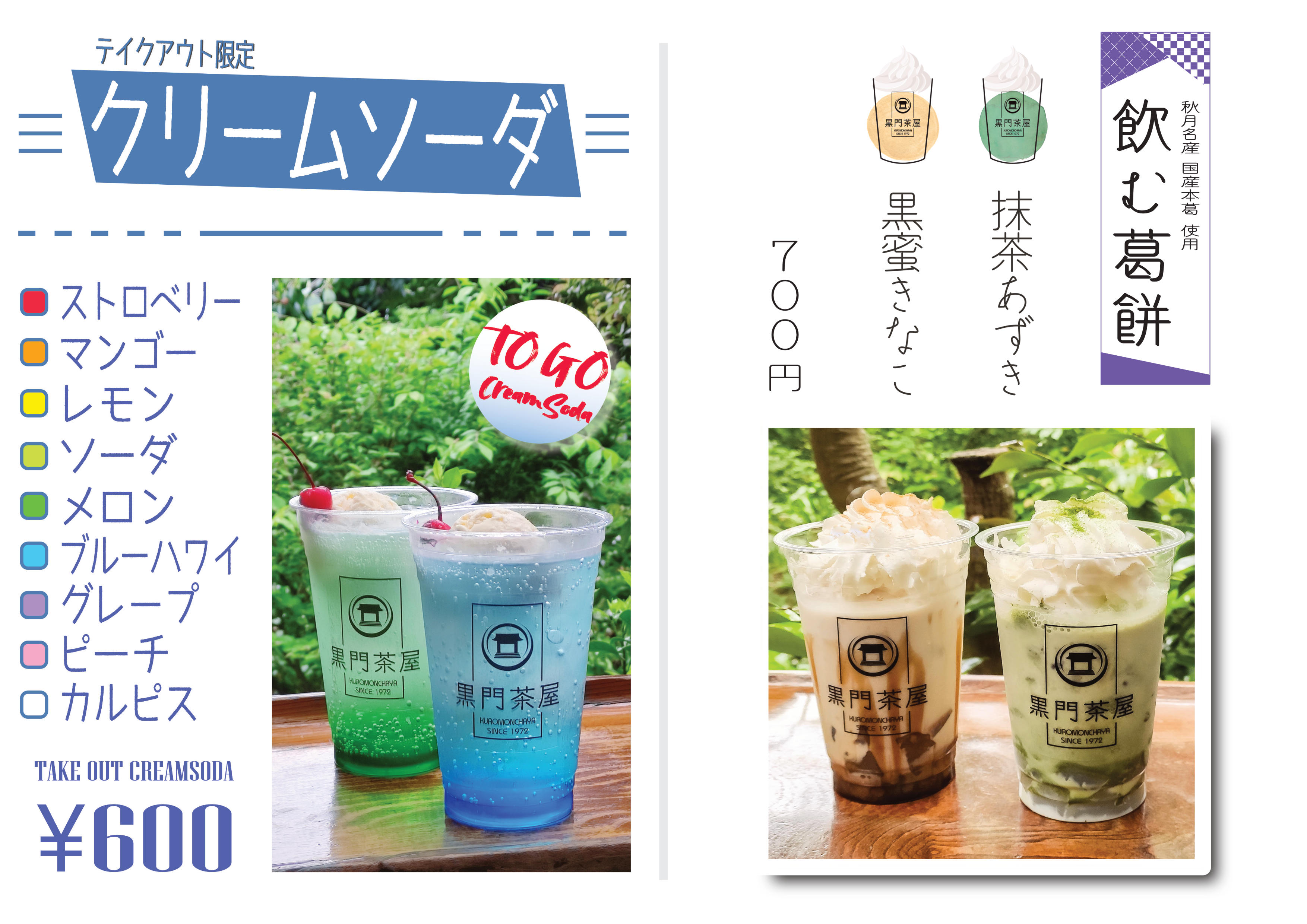 定番のクリームソーダはもちろん、人気の飲む葛餅もテイクアウトができるようになりました! 気持ちの良い初夏、ぜひ城下町散歩のお供にどうぞ。